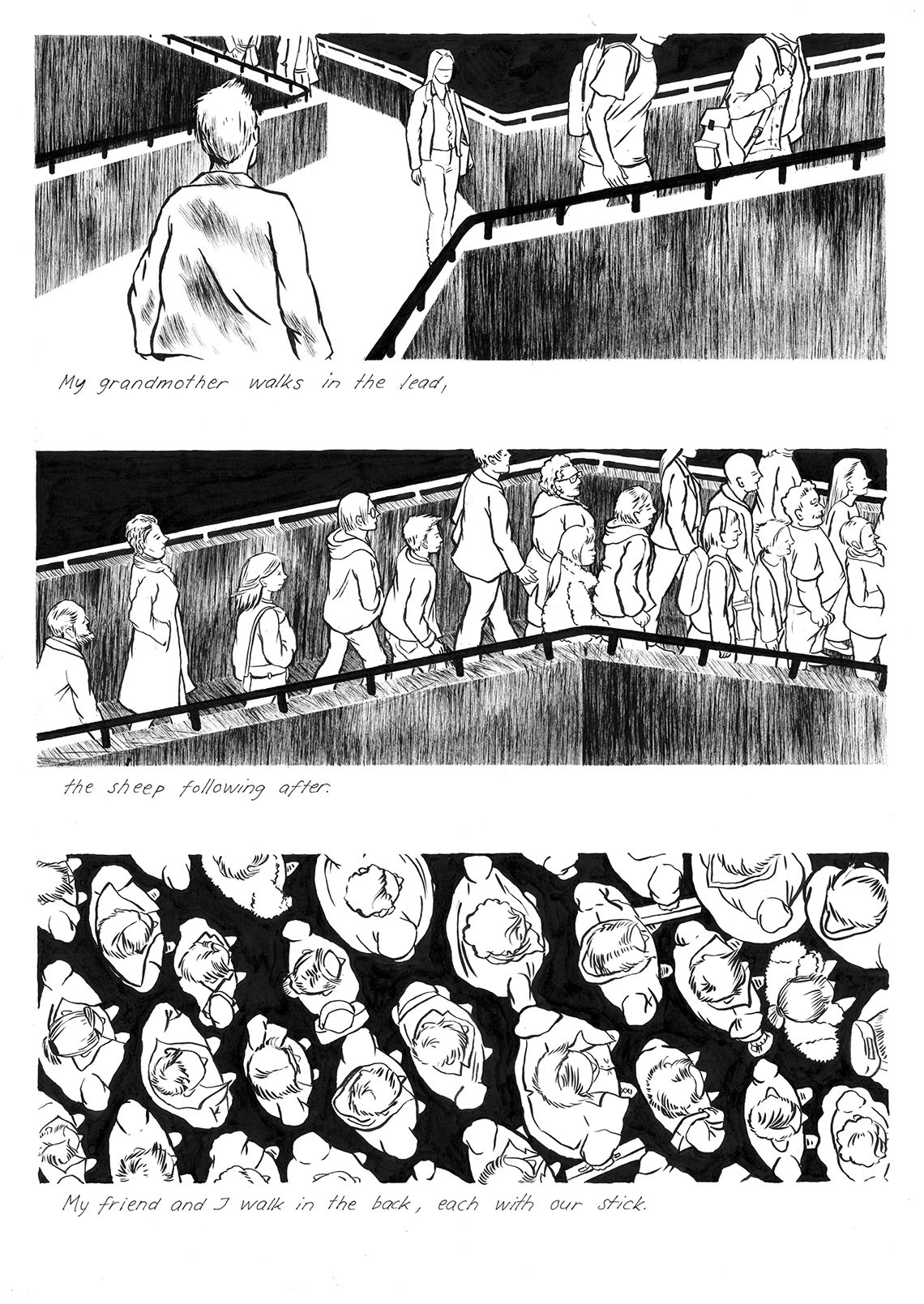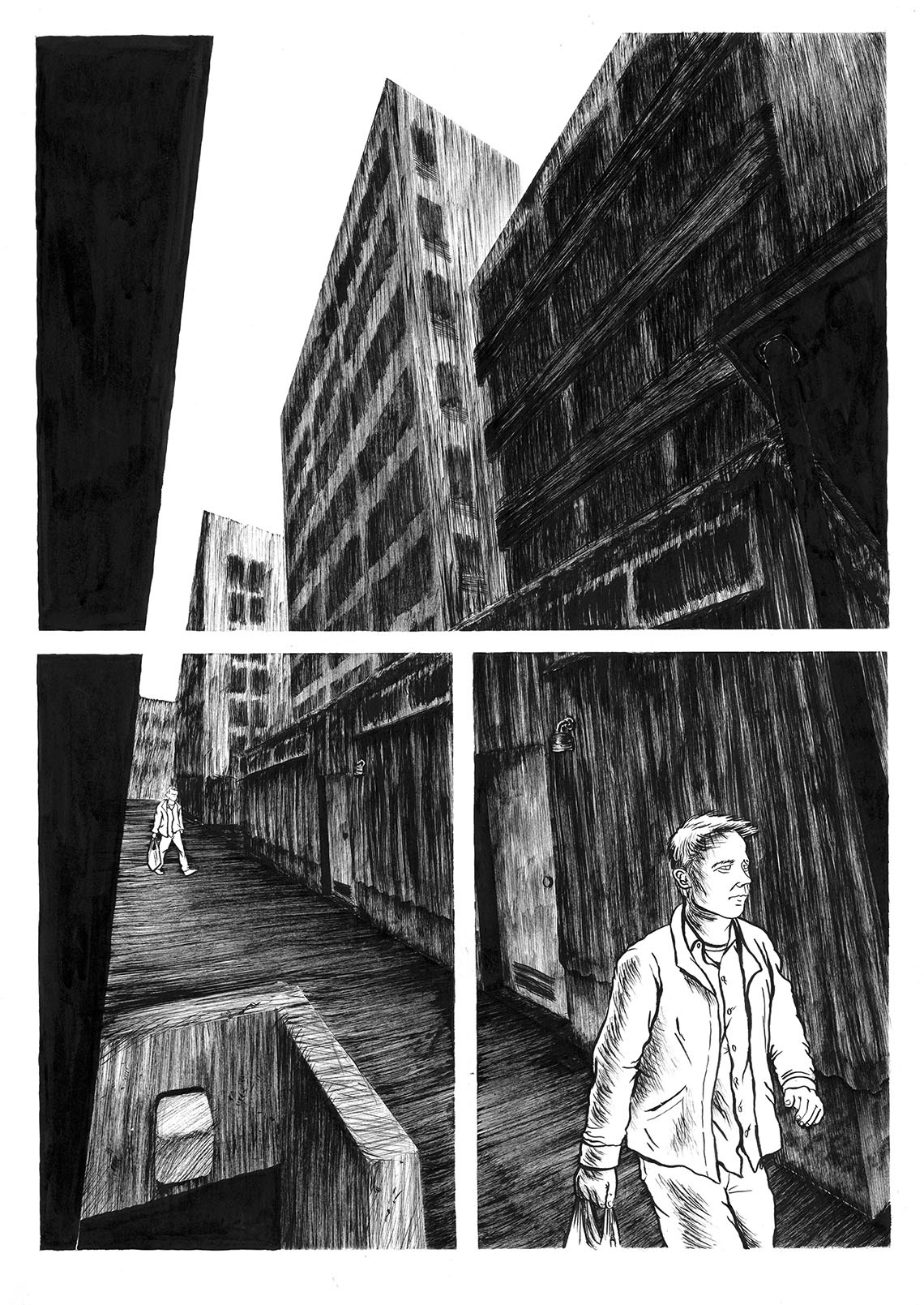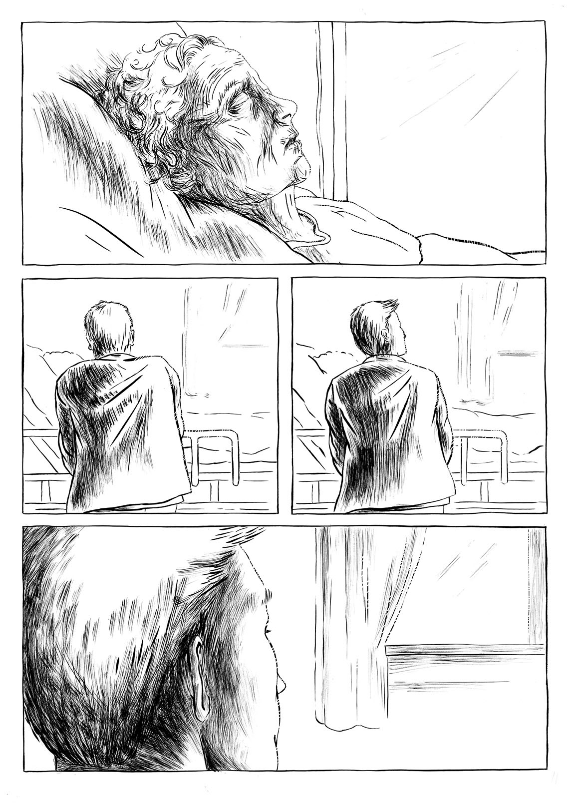 Eleven-page comic done with ink, 2024. Originals 42 cm x 59,4 cm. Text by Jon Fosse.