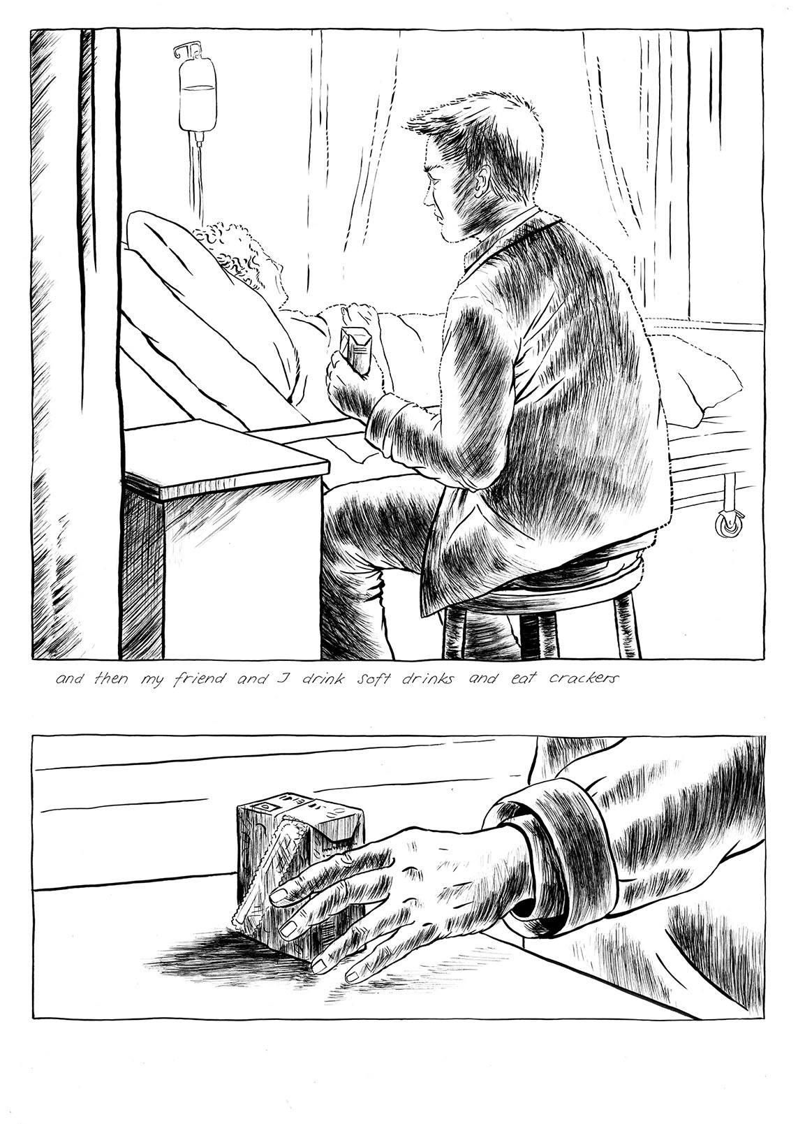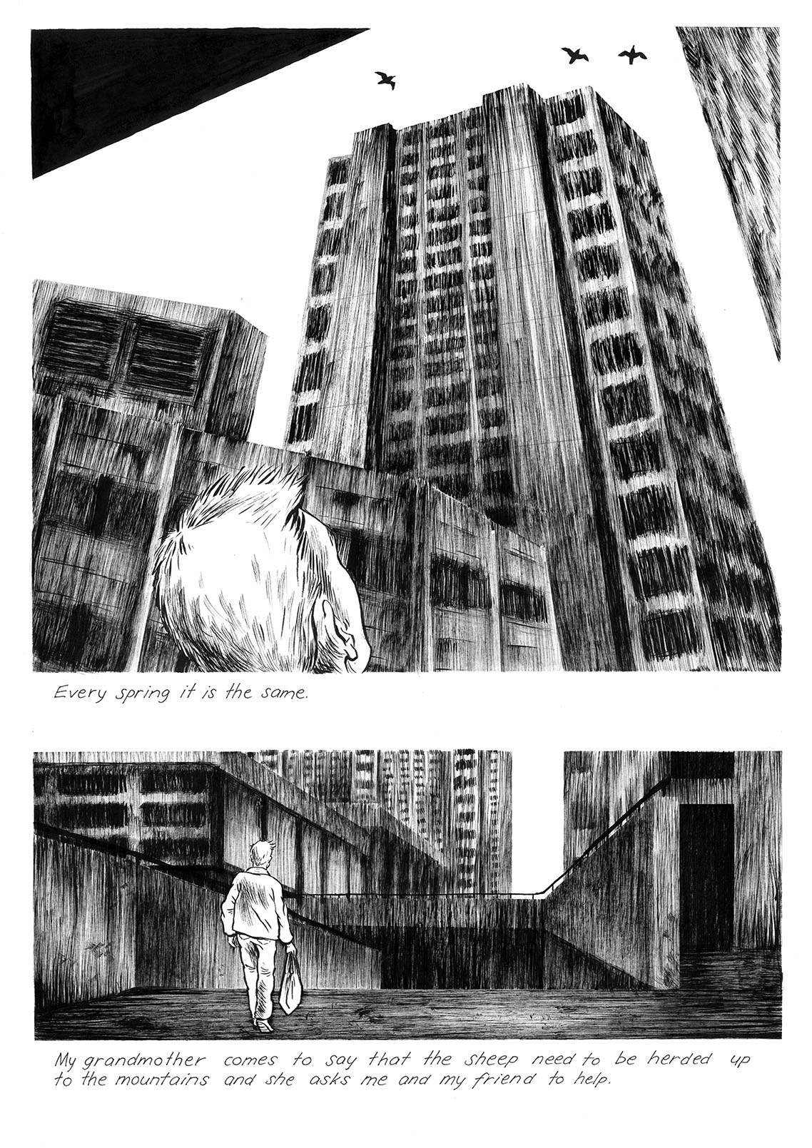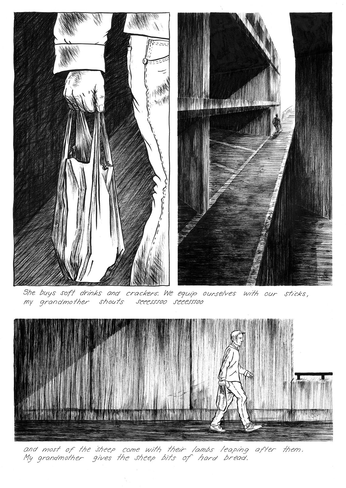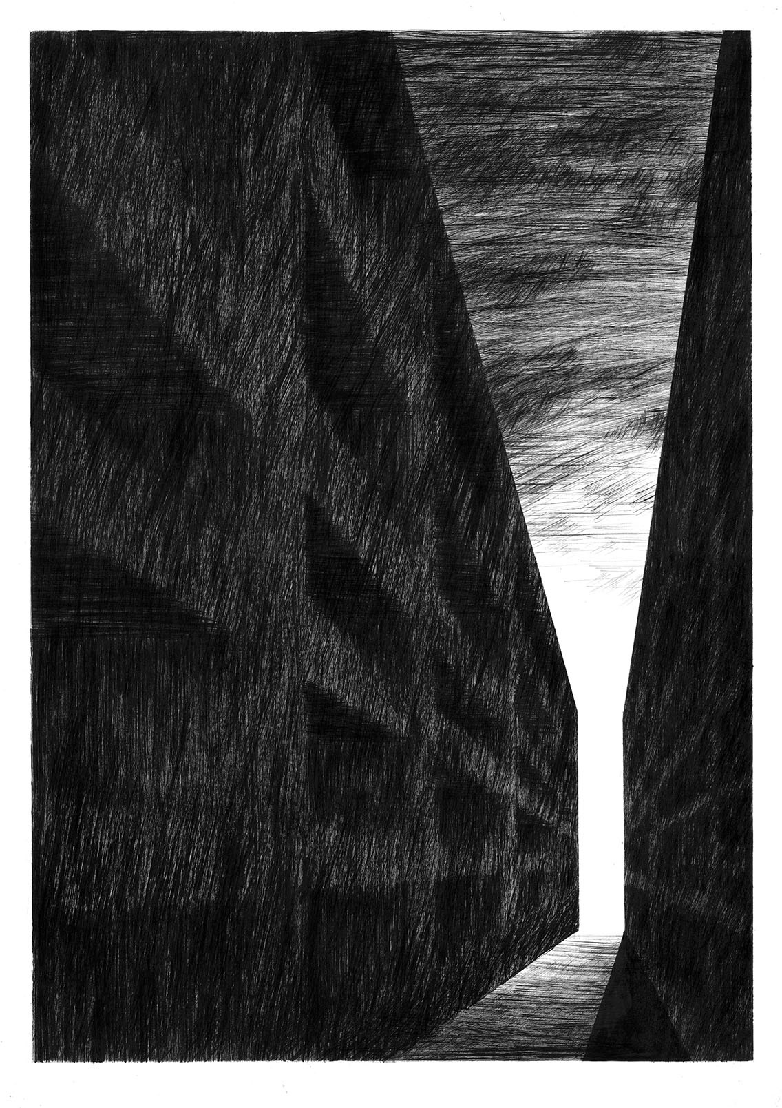 Eleven-page comic done with ink, 2024. Originals 42 cm x 59,4 cm. Text by Jon Fosse.