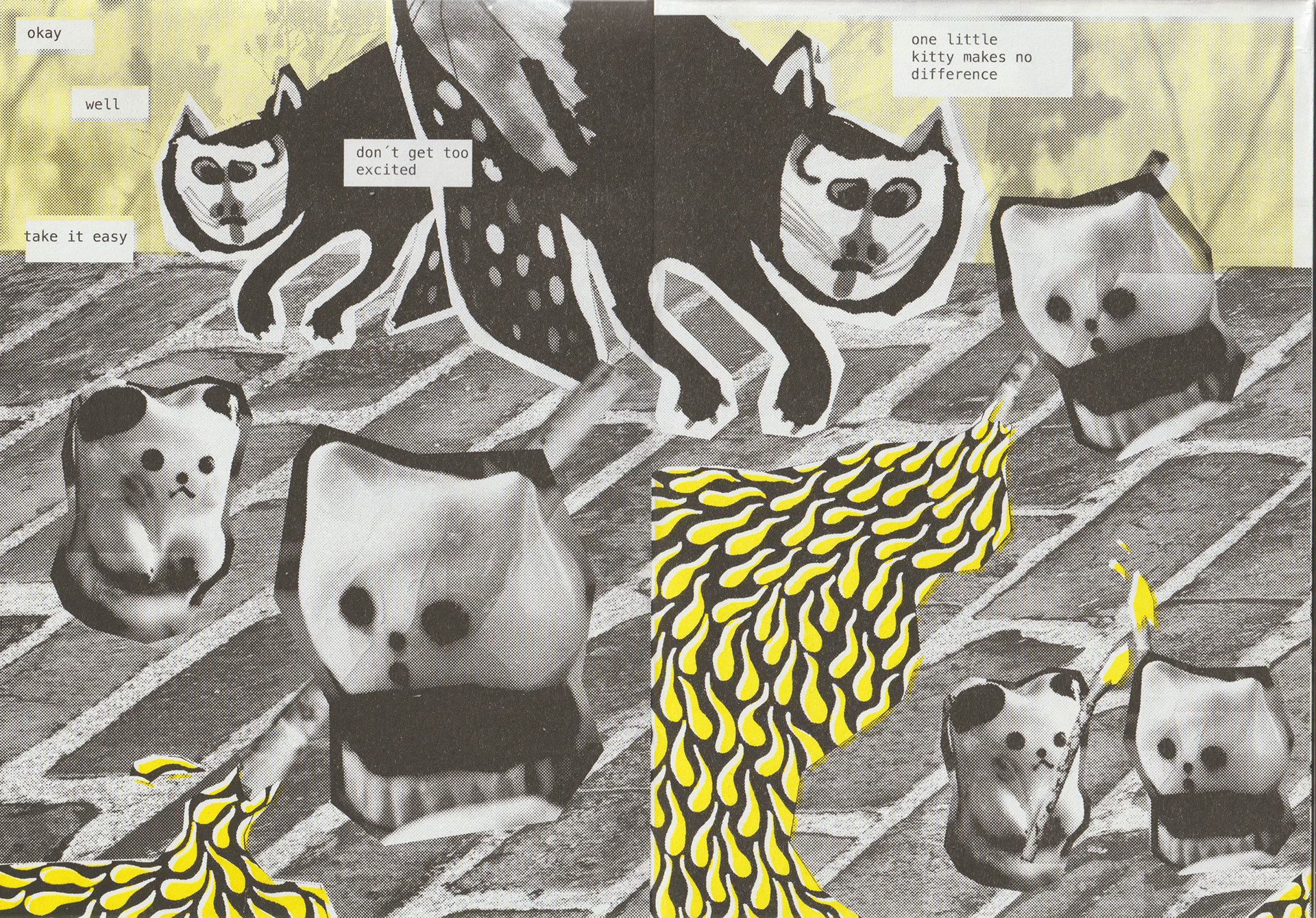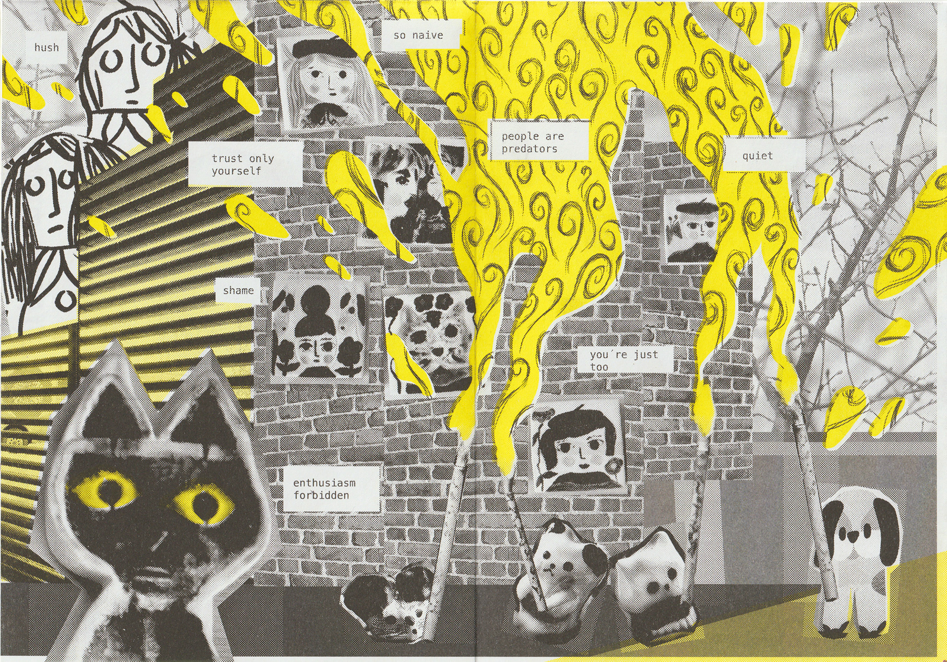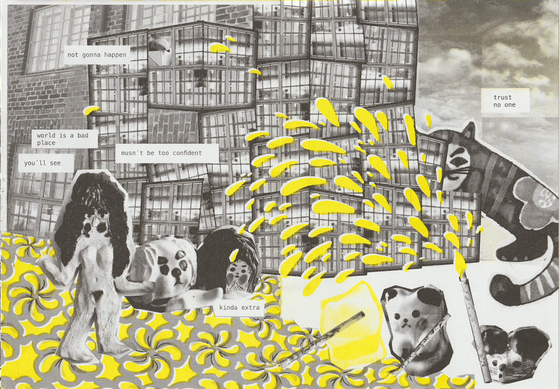 Digital photocollage, digital painting, risograph.